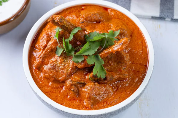 Malse geitenvlees langzaam gegaard in een rijke, gekruide saus, perfect geserveerd met knapperige puri