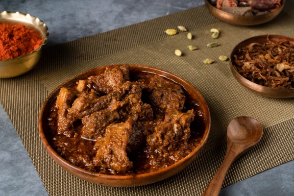 Slow cooked Bihari mutton curry, tender and richly spiced with garlic and mustard oil.